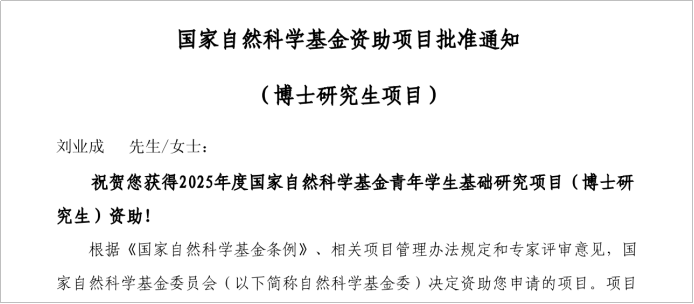 喜报!我院应用地球物理系博士研究生刘业成近日成功获批2025年度国家自然科学基金博士生项目(导师:李帝铨教授),资助经费30万元,资助期限为2年,成为中南大学地球科学与信息物理学院首个获得此项国家级科研项目资助的博士生,同时也是中南大学首批获得该项资助的博士生之一。