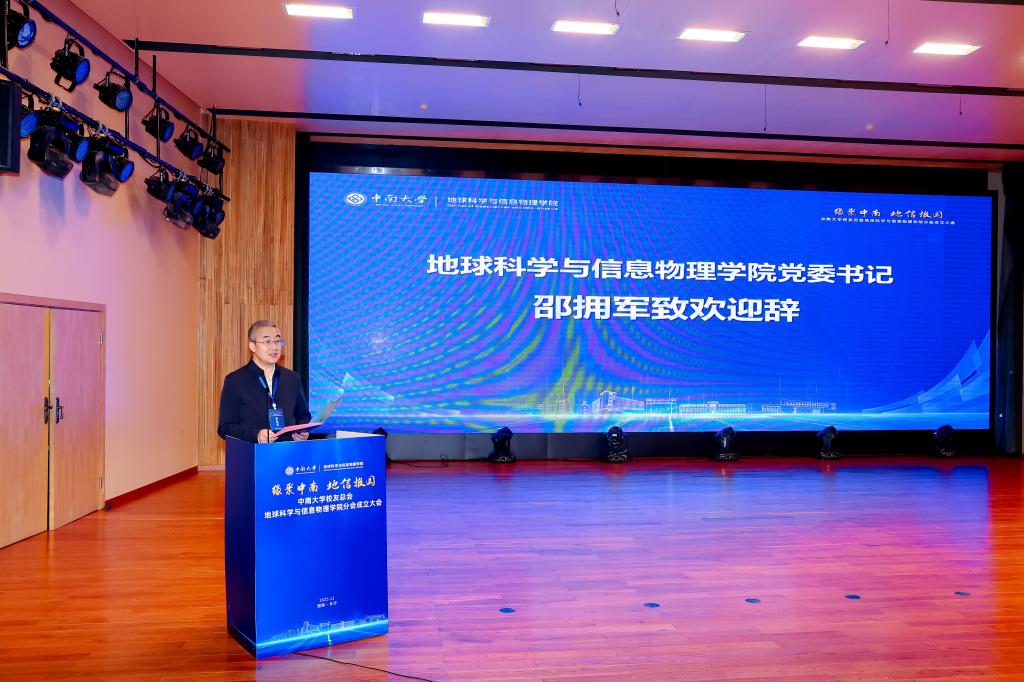 大会伊始,地球科学与信息物理学院党委书记邵拥军致欢迎辞。他回顾学院近年来发展历程中取得的丰硕成果,表达了对学院校友分会成立的热烈祝贺与热切期盼。