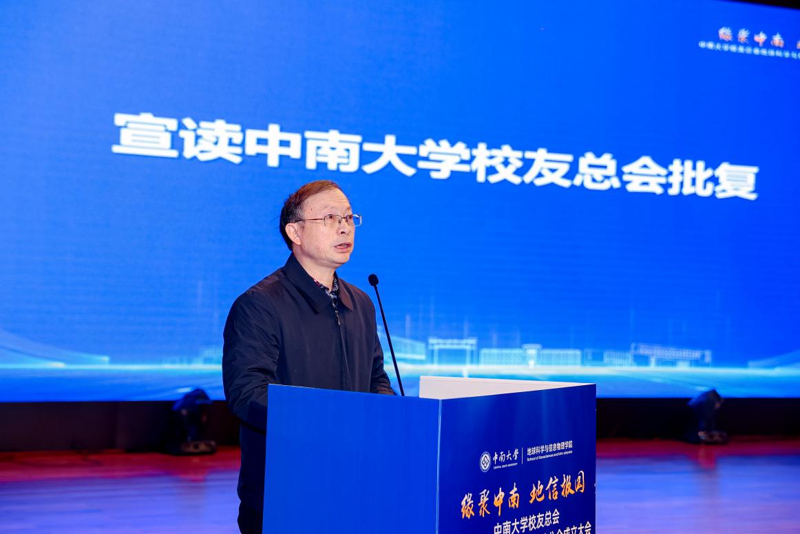 中南大学教育发展与校友事务办公室副主任刘宪军代表校友总会宣读《关于中南大学地球科学与信息物理学院校友分会组织机构的批复》。