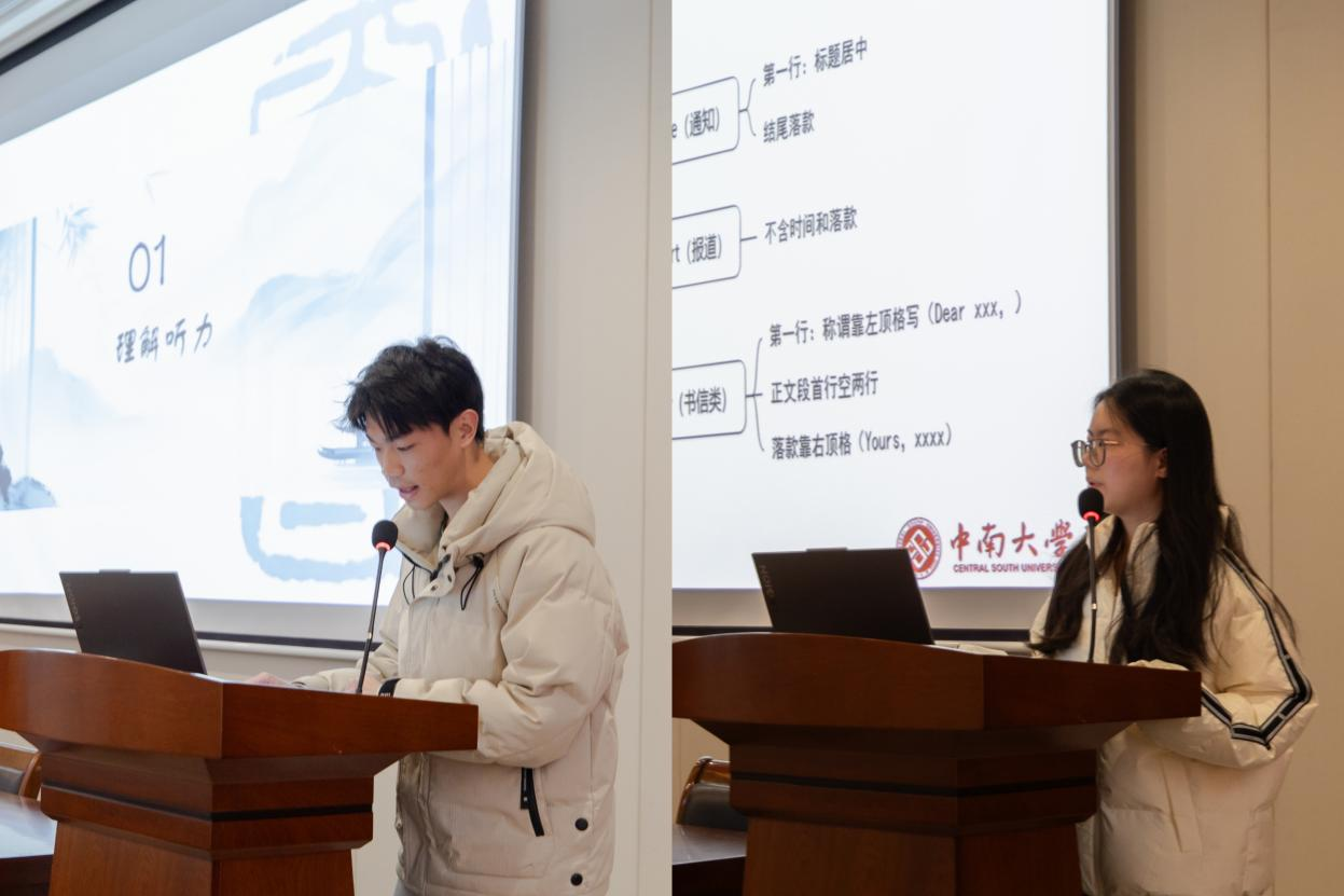 首先,两位主讲人分别进行主题分享:刘澜同学以“四级经验分享之翻译写作篇”为主题,进行了考试题型综述、写作备考攻略、翻译核心技巧以及四级备考期间复习计划方面的分享;黄嘉源同学则从听力、阅读、翻译三方面进行四级考试经验分享。随后,在交流互动环节中,两位主讲人根据现场同学的提问,针对性解答了四级考前准备及考试规范方面的问题。