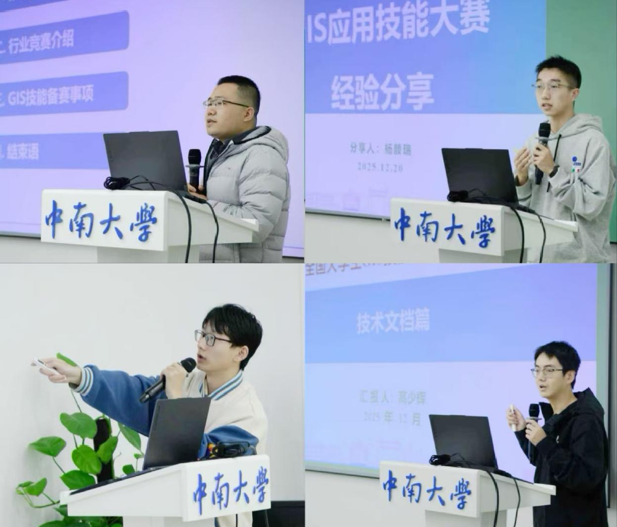 本次活动邀请了中南大学副教授、博士生导师、地理信息系副主任侯东阳老师及在往届大赛中取得优异成绩的杨颜瑞、孟令闯、高少辉三位同学进行分享。
