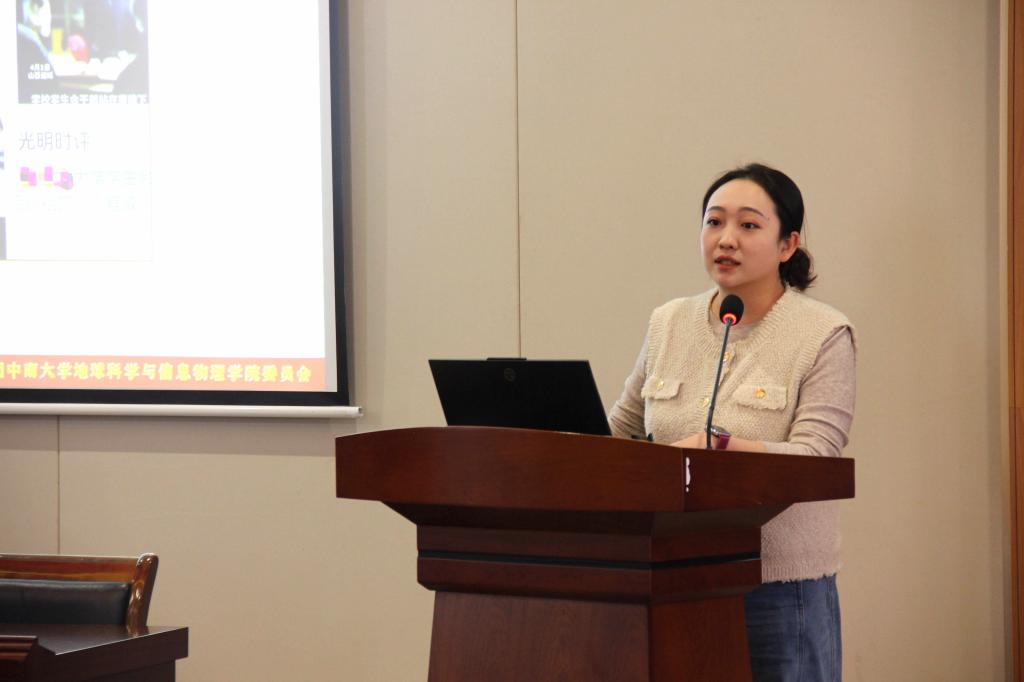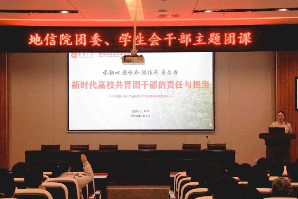 为加强地信院团委、学生会干部队伍思想建设,强化服务意识,提升综合履职能力,2026年4月1日下午,学院团委书记刘琦为全体团学干部讲授题为“新时代高校共青团干部的责任与担当”主题团课,院团委、学生会全体学生参会。