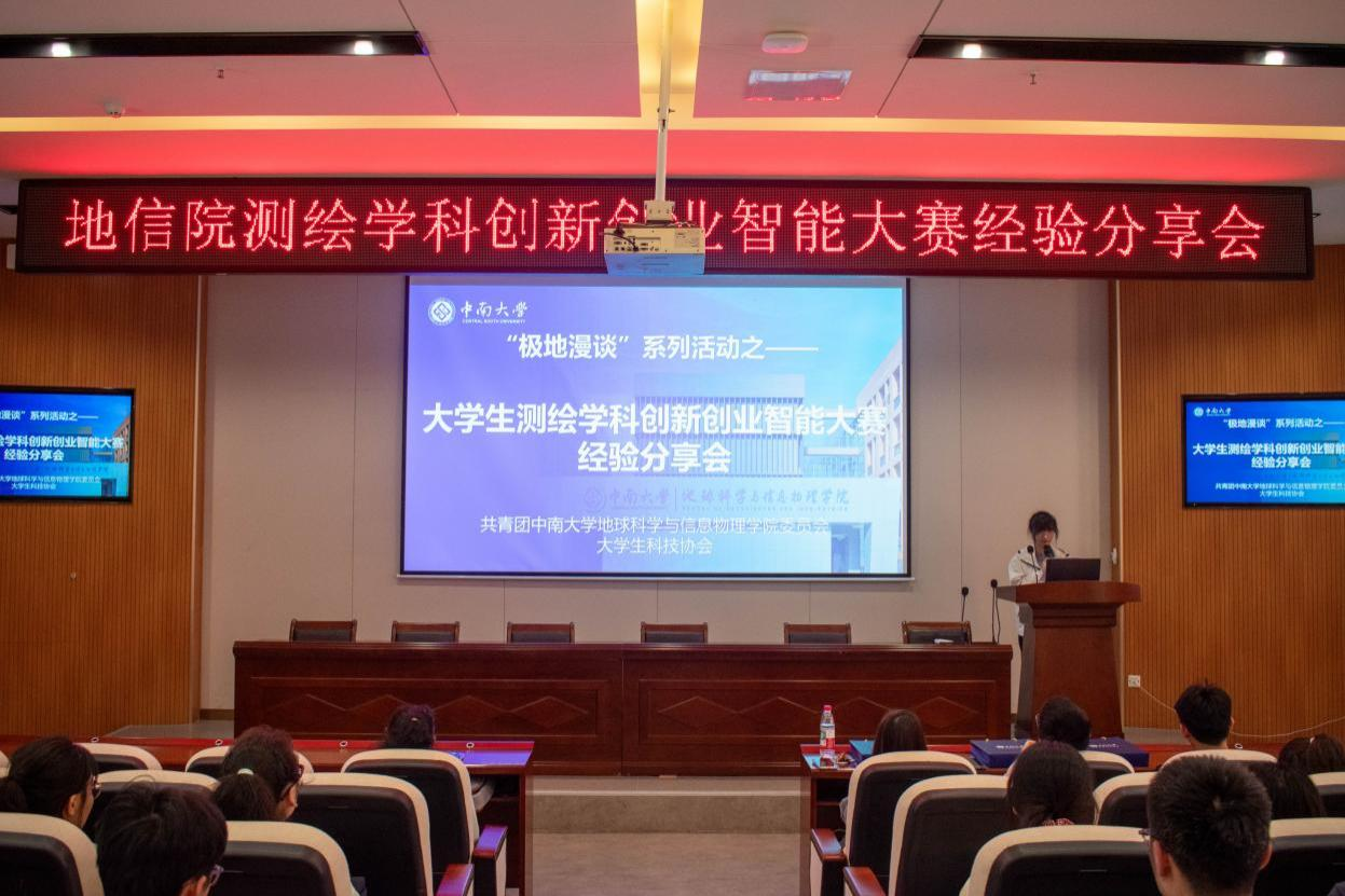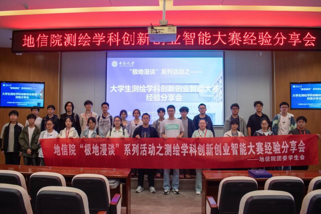 为进一步帮助地信学子全面掌握大学生测绘学科创新创业智能大赛的相关知识技巧,助力学子把握竞赛机遇、提升创新能力,地信院“极地漫谈”系列之大学生测绘学科创新创业智能大赛经验分享会于2026年4月18日14:30在地科楼127报告厅顺利举行。本次活动由地信院团委学生会主办、院大学生科技协会承办,蒋梦怡同学主持,吸引了来自全校4个学院共计46名学生参会。