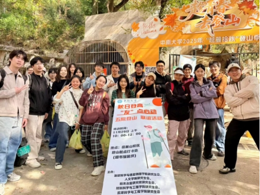 为丰富研究生课余生活,缓解学业科研压力,搭建跨学院交流平台,11月29日上午,人文学院、材料科学与工程学院、粉末冶金研究院、地球科学与信息物理学院、能源科学与工程学院联合主办的“秋日登高,‘友’点心动”主题登山联谊活动在岳麓山顺利开展,80余名研究生学子携手赴秋约、话情谊。