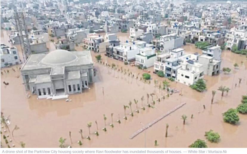 “Almost half of the ParkView City society is full of water. In most houses of its six blocks, the accumulated water level is five to six feet, which is impossible to be drained out by the residents on their own. Moreover, the residents have already shifted either to their native towns or the relatives in Lahore,” Muhammad Abdullah, a resident of the society, says while explaining Friday’s situation to Dawn when contacted.
