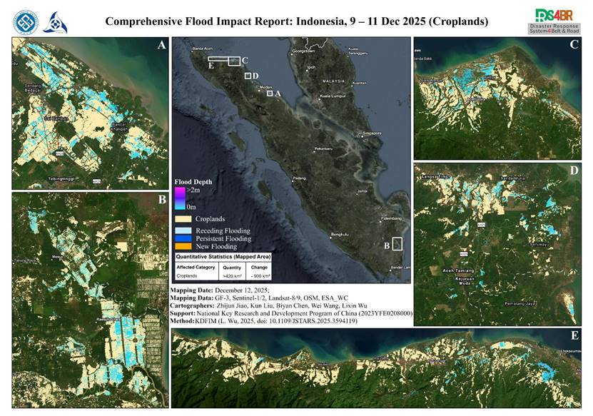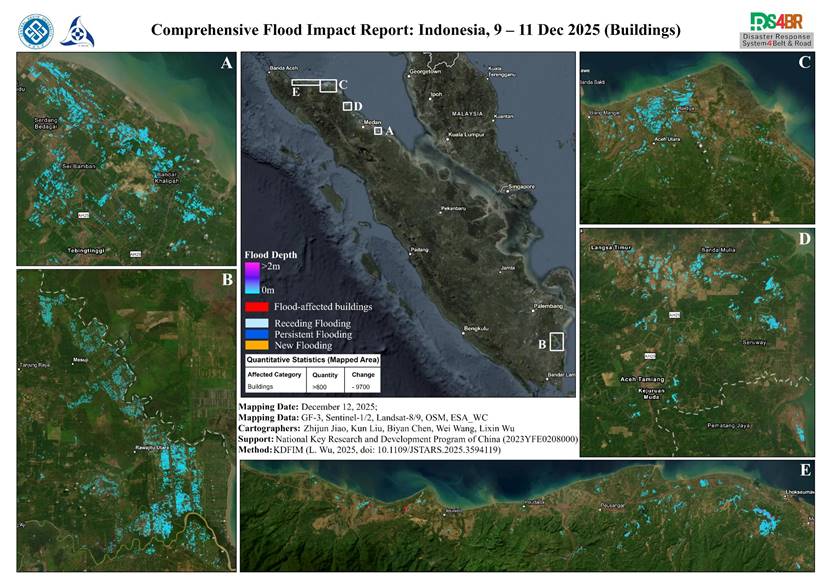At the urgent request of the Indonesian government institution (BRIN), the disaster-response team led by Professor Lixin Wu of Central South University, Academician of the International Eurasian Academy of Sciences, conducted rapid flood monitoring and assessment across Indonesia. The initial assessment covered November 26 to December 1, 2025 (https://gip.csu.edu.cn/info/1483/8234.htm), and the follow-up assessment from December 3 to 10, 2025 (https://gip.csu.edu.cn/info/1483/8236.htm), tracked the evolving flood situation. Referring to the previous assessments, the latest update for December 9 to 11, 2025 provides the most recent evaluation of flood conditions and impacts. All assessments utilized the Disaster Response System for the Belt and Road (DRS4BR) and its Knowledge-Driven Flood Intelligent Monitoring (KDFIM) module, enabling rapid flood detection and impact analysis.
