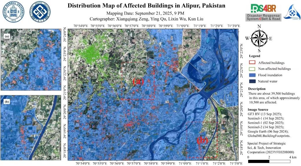 In early September 2025, Alipur District (approximately 29.3°N–29.4°N, 70.9°E–71.1°E) experienced severe flooding caused by intense rainfall and upstream inflows. Using available multiple satellite observations(Gaofen-3, Sentinel-1, Sentinel-2), we conducted a preliminary assessment based on flood inundation extent and building impact mapping. Results indicate that the district contains approximately 39,500 buildings, of which about 10,500 were affected. This assessment is derived solely from remote sensing data.